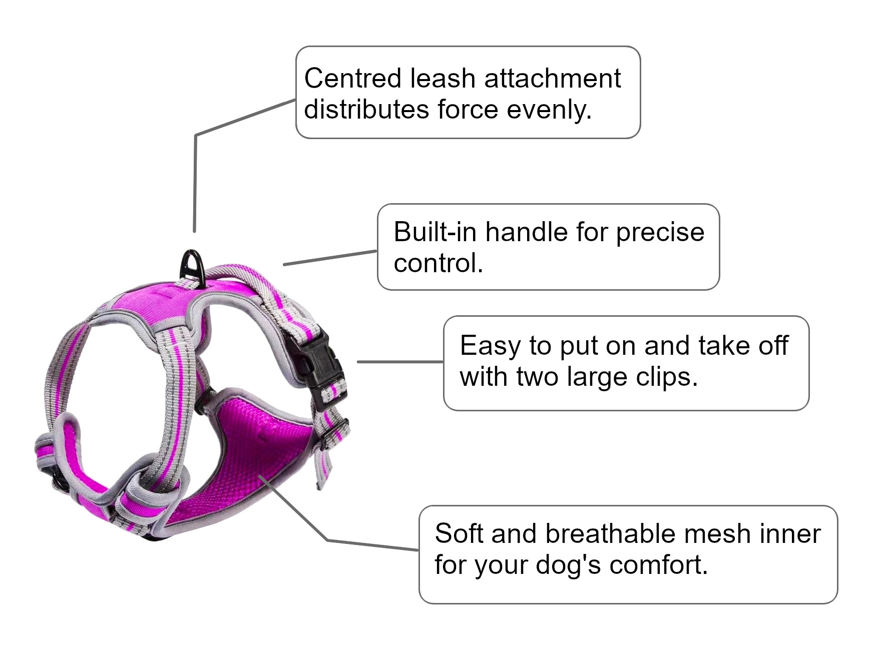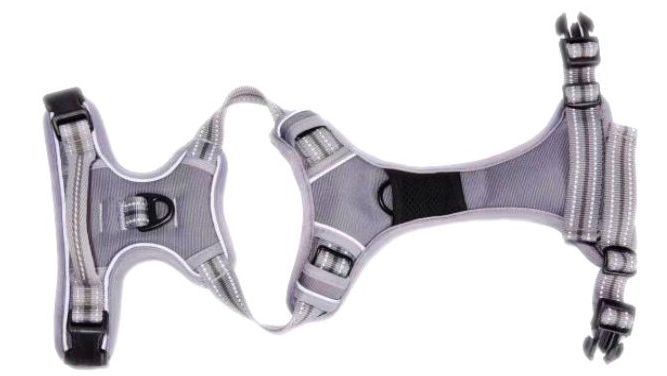 • Large clips make the harness easy to put on and take off.