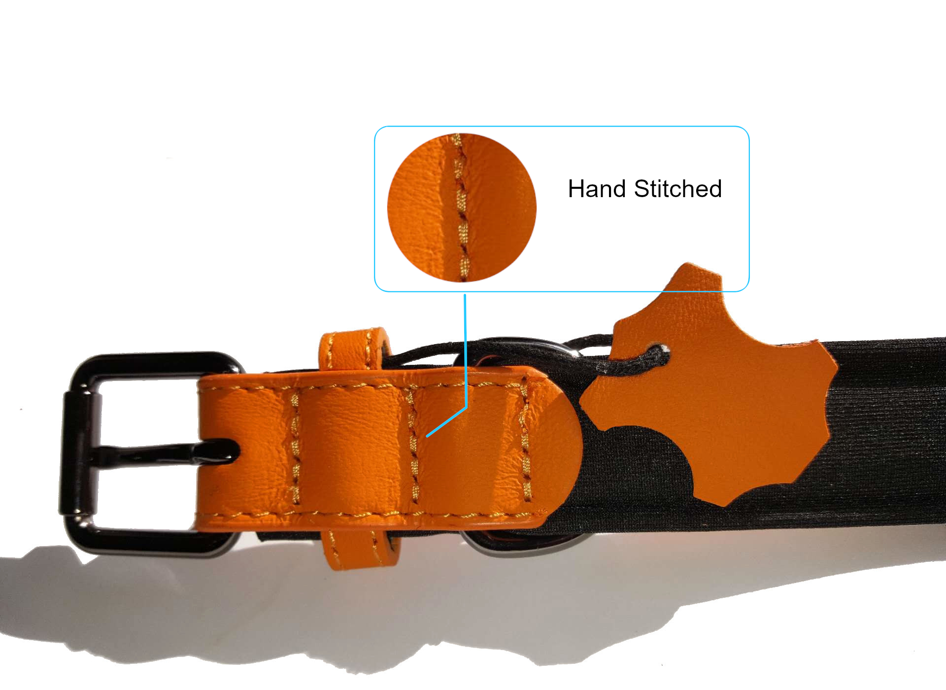 The St Vincent Sunset collar features a hand-stitched, dual layer construction with a soft, padded inner layer, and a smooth outer layer made from genuine leather. The buckle and d-ring are solid zinc alloy. Available in burnt orange and turquoise.